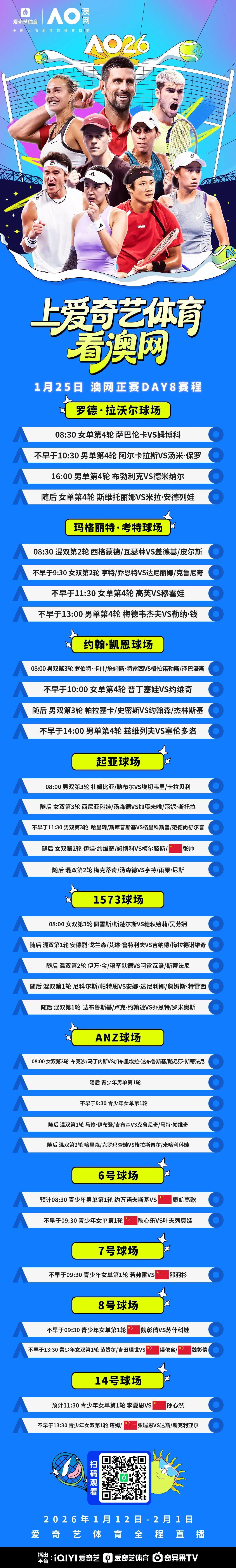 北京时间1月25日,2026澳大利亚网球公开赛第8比赛日将如期进行,爱奇艺体育将继续为您全程直播所有精彩对决。